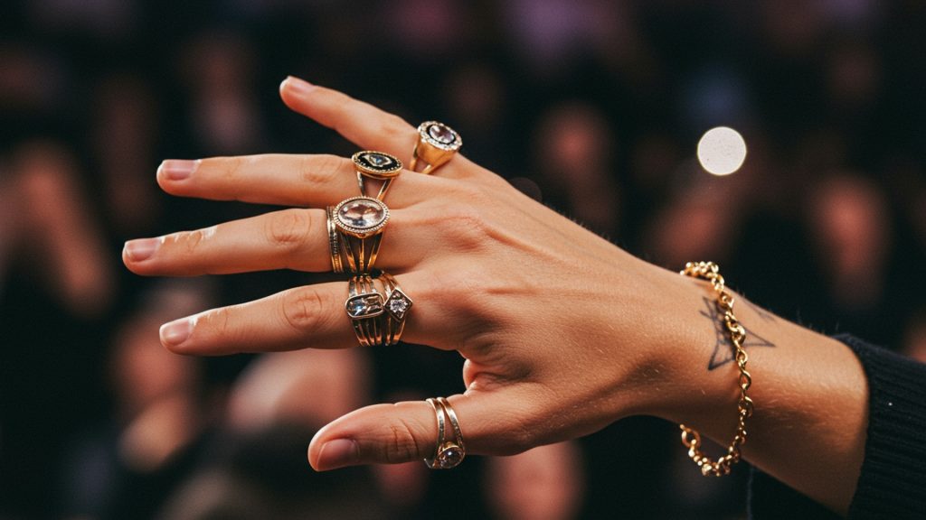 हैरी स्टाइल्स के खास रिंग कलेक्शन से प्रेरित, एक स्टाइलिश हाथ जो आधुनिक फैशन ट्रेंड्स को दर्शाता है।