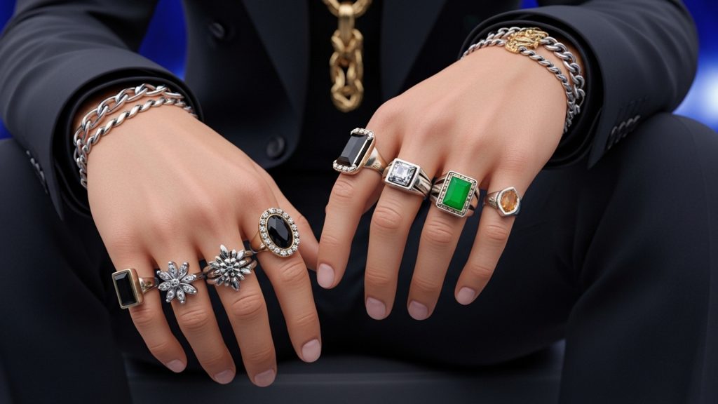 - मिक्स एंड मैच: वे विभिन्न धातुओं (जैसे सोना, चांदी), स्टाइल्स (आधुनिक, विंटेज) और आकारों की अंगूठियों को एक साथ पहनते हैं। यह एक अनूठा और व्यक्तिगत लुक देता है।