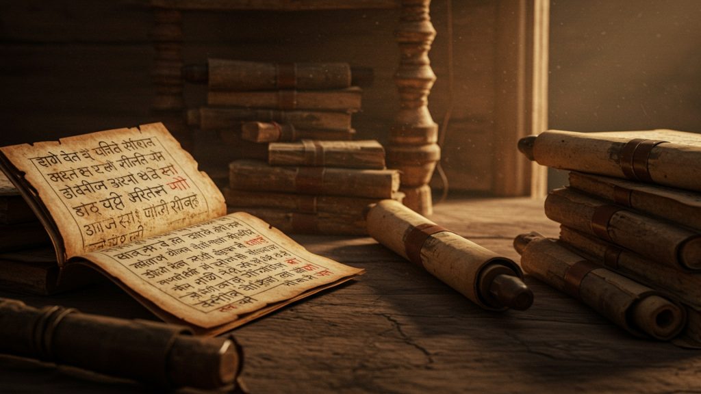 मनुस्मृति के रहस्य को उजागर करते प्राचीन भारतीय ग्रंथों का एक चित्रण, जो इसके सरल परिचय को दर्शाता है।